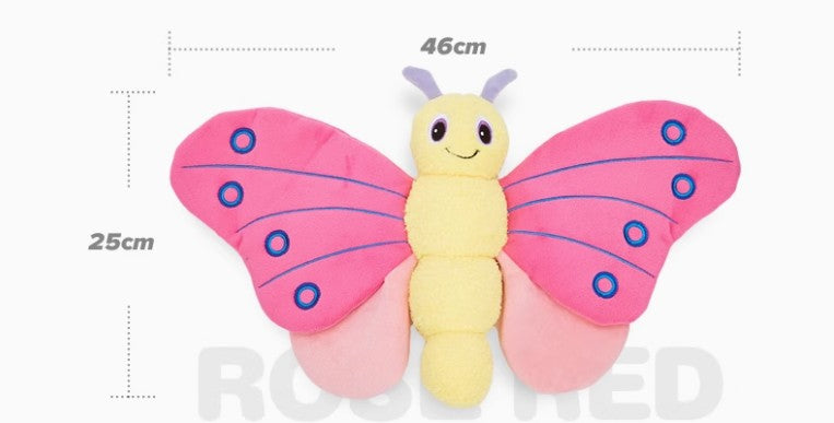 These enormous butterflies have loud crinkly wings and a squeaker in the middle of the body, they are also very soft to help clean your dog's teeth. The wings feature a smooth fabric whereas the body is longer and softer.